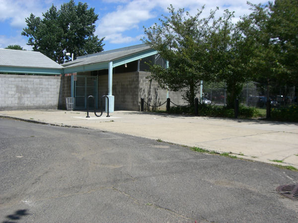 A view of the pool-house at the base of Union Street, with generous parking for pool patrons.